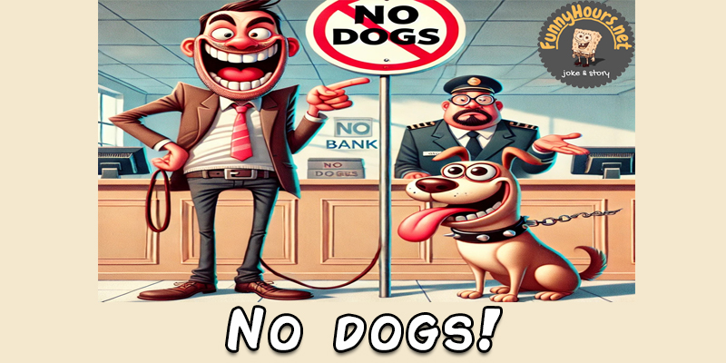 A man with a dog walks into a bank that has a sign reading “No dogs.” A security guard walks up to him and asks “Did you read the sign? No dogs.”